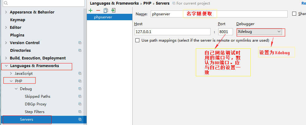 4、设置服务器,在 PHP>Servers 中,将对应服务器的调试工具修改为“Xdebug”,如果没有,请创建。这里的 “Port” 为服务器运行端口