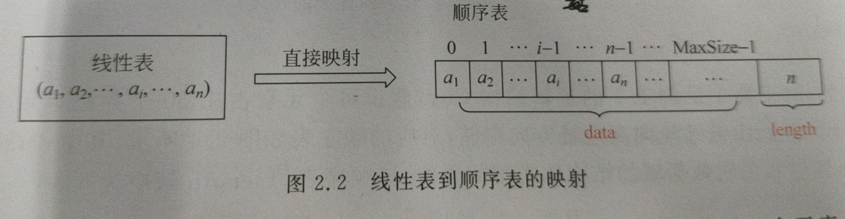 如上图所示:由于线性表中逻辑上相邻的两个元素在顺序表中也相邻,这种映射称作直接映射。