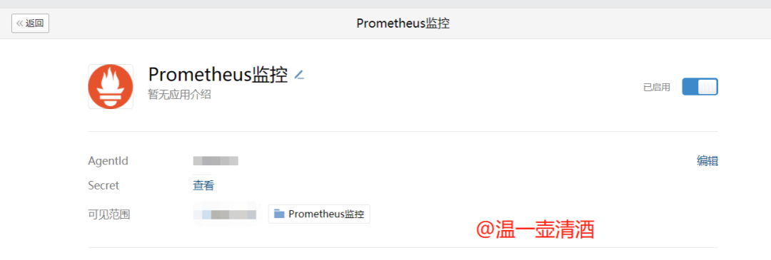 我们从图中可以看到,有AgentId,AgentId先复制保存下,后续会用到;还有Secret,获取Secret,点击查看后,Secret是发送到企业微信中的,自己到微信终端中查看即可。