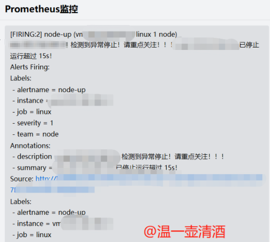 再次停用node服务,查看消息推送,告警消息如下所示: