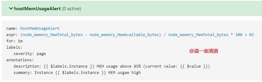 上述示例 hostMemUsageAlert 规则,添加到/prometheus/rules目录下的规则中,并重启Prometheus服务,使配置生效。