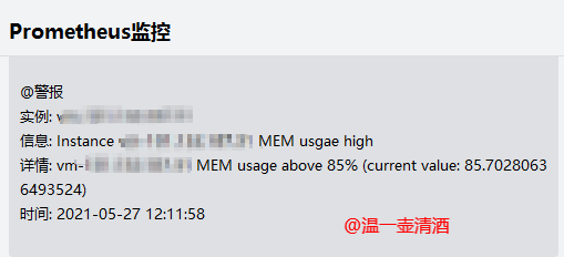 注意:规则配置内存使用率超过85%则会出发警报,如果大家的服务器内存够大,目前使用率不高,但又想检测下规则是否能正常触发,将85降低即可。