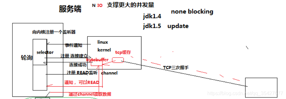 整个流程都基于事件通知机制,服务器端当没有监听到事件时系统资源可以干其他事情,当然这种事件通知机制也依托于系统内核。java早起服务器端开发性能远远差于c,c++,正是jdk1.4前没有利用操作系统,使用传统BIO(在其基础上优化,加入线程池起到一定缓解作用)。NIO虽然称为异步非阻塞,其实本质是伪异步非阻塞,selector还是在循环监听各种状态,只是相对BIO前进了一大步。jdk1.7后出现的AIO是真正的异步非阻塞IO,后续再研究。