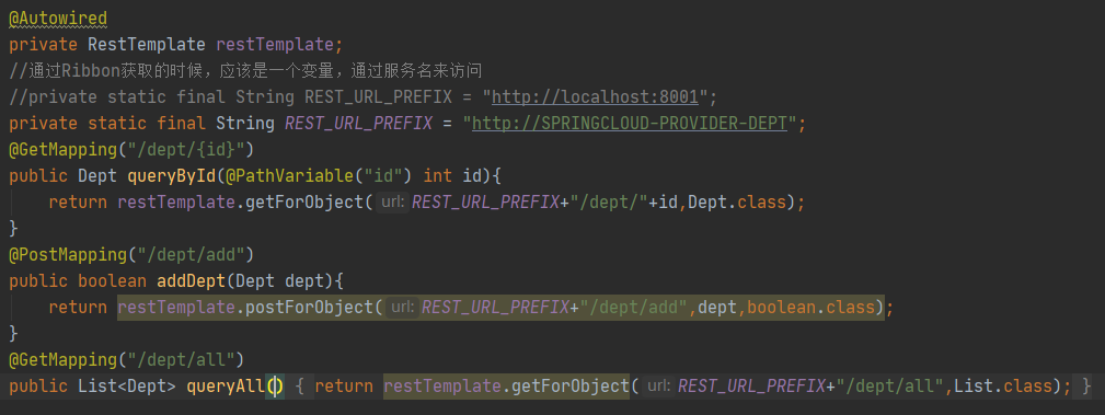 @FeignClient("SPRINGCLOUD-PROVIDER-DEPT") //服务提供方在eureka中注册的名称