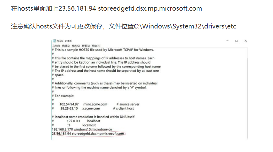 在hosts文件的最后一行加上 23.56.181.94 storeedgefd.dsx.mp.microsoft.com