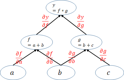 注意图中的 leaf_node,叶子结点就是由用户自己创建的Variable变量,在这个图中仅有a,b,c是 leaf_node。为什么要关注leaf_node?因为在网络backward时候,需要用链式求导法则求出网络最后输出的梯度,然后再对网络进行优化,如下就是网络的求导过程。