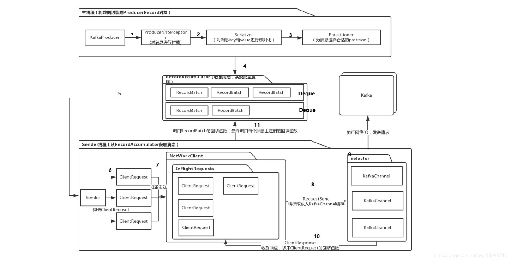 RecordAccumulator里面包含 ConcurrentMap<TopicPartition, Deque<RecordBatch>> batches;