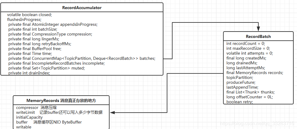Deque<RecordBatch> RecordBatch包含多个MemoryRecords,才是真正放消息的地方