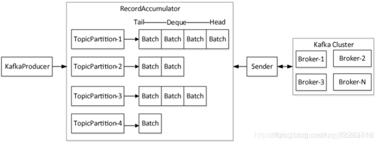 其作用相当于一个缓冲队列,会根据主题和分区(TopicPartition对象)对消息进行分组,每一个TopicPartition对象会对应 一个双端队列Deque<ProducerBatch>,ProducerBatch表示一批消息,在KafkaProducer发送消息时,总是从队列队尾 (Tail)取出ProducerBatch(如果队列不为空),而Sender是从队列头(Head)取ProducerBatch进行处