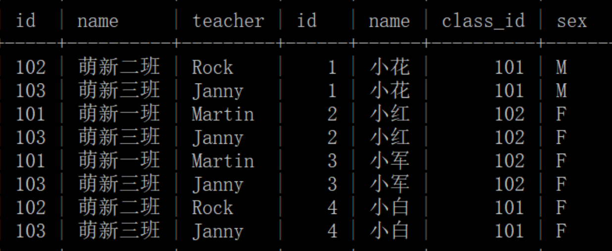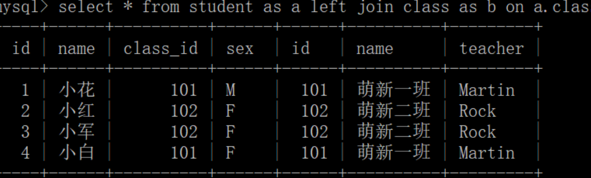 mysql>select * from class as a inner join student as b where a.id = b.class_id; |