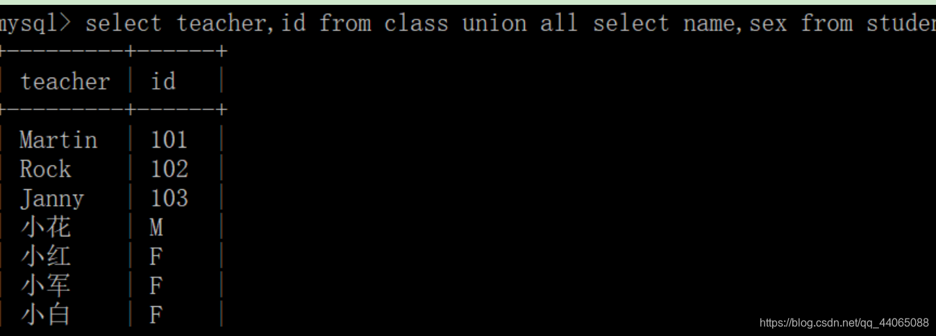 mysql> use school; #选择数据库school mysql> select teacher from class union all select name from student;#查询班级表所有老师和学生表中所有学生姓名 mysql> select teacher as people from class union all select name as people from student;#同上,使用别名查询 mysql> select teacher,id from class union all select name,class_id from student; #查询班级表所有(老师、班级ID)和学生表中所有学生(姓名、班级ID) |
