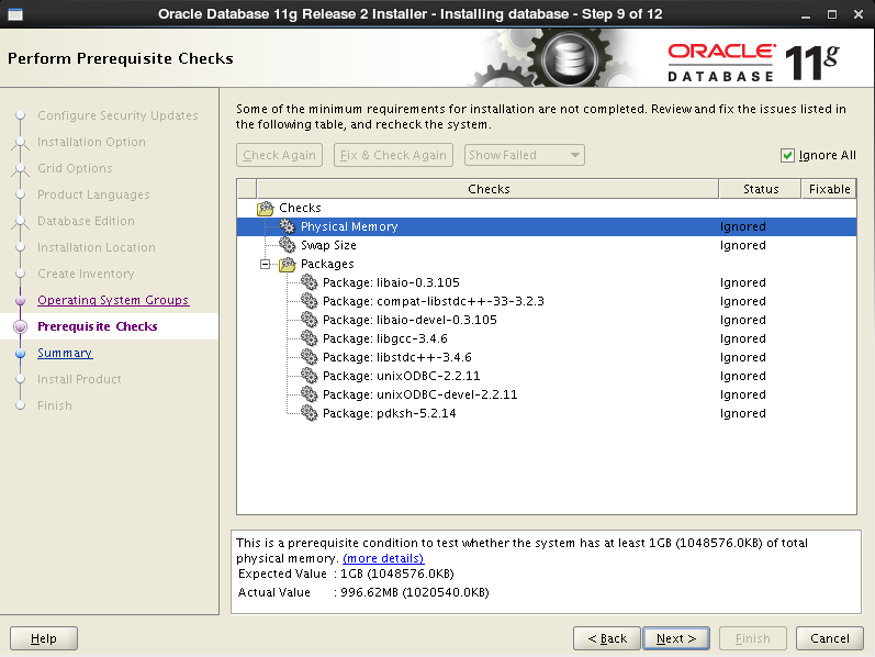 如果安装的软件包版本高于Oracle检测的软件包版本,可以忽略,勾选右上方的ignore all,直接点击next