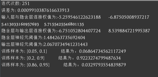 本实验中,样本数据如表一所示,默认配置:最大迭代次数为10000,最大误差为0.001,学习因子为0.5,动量为0.9。实验结果在实验内容部分给出。