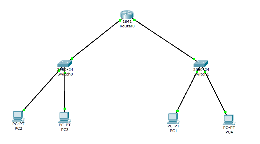 先连接线路下图,分别配置好pc的ip地址,pc2和pc3一个网段,pc1和pc4一个网段