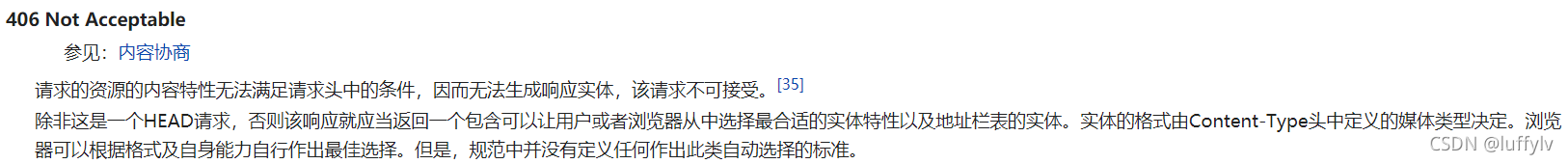 说白了就是,不管是前端调用后端接口得到数据还是跨服务间接口的调用,若被调用者返回的数据的格式与调用者期望得到的数据格式不符或不能转换为调用者想要转换的数据格式便会报406异常。