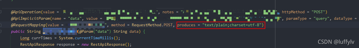 可以通过@RequestMapping注解中的produces属性设置响应体类型和字符编码,可以看到上面接口设置的响应体类型为纯文本的形式。虽然纯文本内容的格式是json形式,但不能直接使用别的类型来转换接收。需要用String类型来接收该返回值,然后再转成JSONObject类型数据。