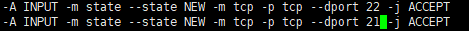 在行上面有22 -j ACCEPT下面另起一行输入跟那行差不多的,只是把22改为21,然后:wq保存退出修改,