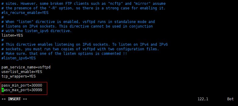 默认是开启的,但是要指定一个端口范围,打开vsftpd.conf文件,在后面加上