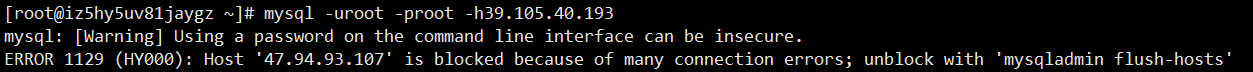 service iptables restart (3)mysql账户密码错误:用"mysql -u用户名 -p密码 -h主机ip"尝试登录主机,笔者就是这个问题,提示因为连接失败次数太多,导致远程连接被拒