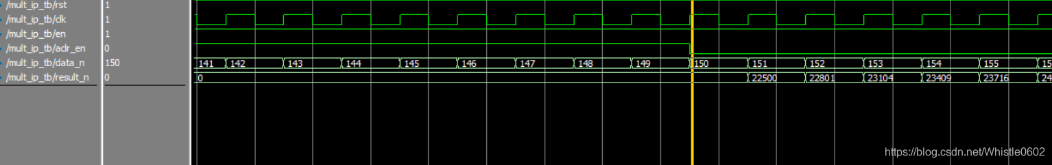 这是加入了异步清零洗好aclr,高电平有效,从图中可以看出在输入变为150时,aclr由0变1,一个时钟周期后输出了150^2的值,150之前输出全部为0。