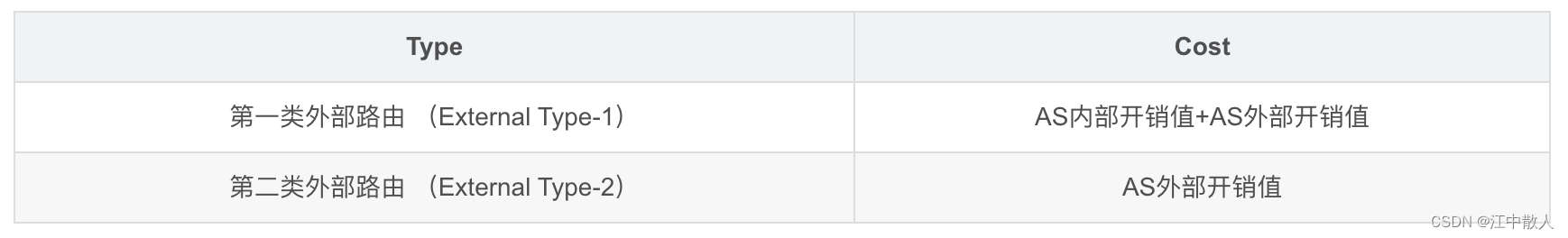 - 第一类外部路由的AS外部开销值被认为和AS内部开销值是同一数量级的,因此第一类外部路由的开销值为AS内部开销值(路由器到ASBR的开销)与AS外部开销值之和;这类路由的可信程度高一些,所以计算出的外部路由的开销与自治系统内部的路由开销是相当的,并且和OSPF自身路由的开销具有可比性。