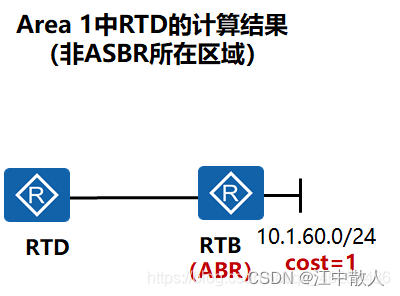 以Area 1中RTD的外部路由计算为例:RTD收到五类LSA后,根据Adv rtr字段1.1.1.1发现,ASBR与自己不同属于一个区域,再查找Ls id为1.1.1.1的四类LSA,发现此四类LSA的Adv rtr为2.2.2.2。再根据五类LSA中的LS id、Net mask、Metric字段最终生成目的网络10.1.60.0/24 cost=1,下一跳为RTB的路由。