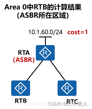 以Area 0中RTB的外部路由计算为例:RTB收到五类LSA后,根据Adv rtr字段1.1.1.1发现,ASBR与自己同属于一个区域(Area 0),再根据Ls id、Net mask、Metric字段最终生成目的网络10.1.60.0/24 cost=1,下一跳为RTA的路由。