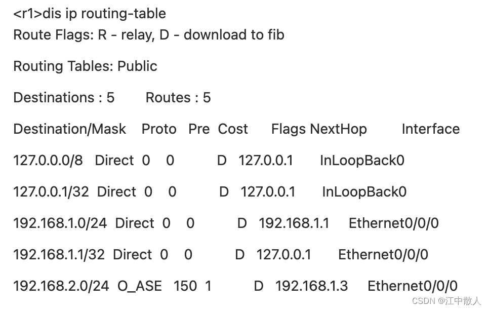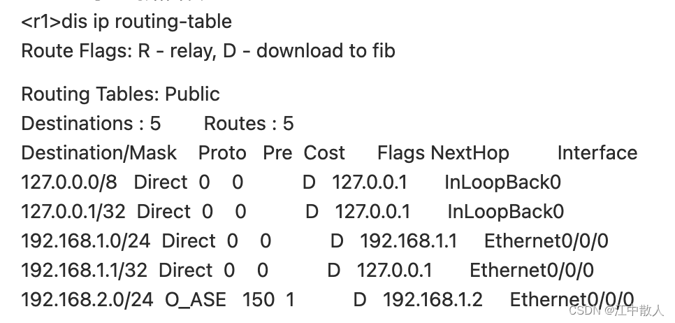 注意:192.168.2.0/24 O_ASE 150 1 D 192.168.1.3 Ethernet0/0/0