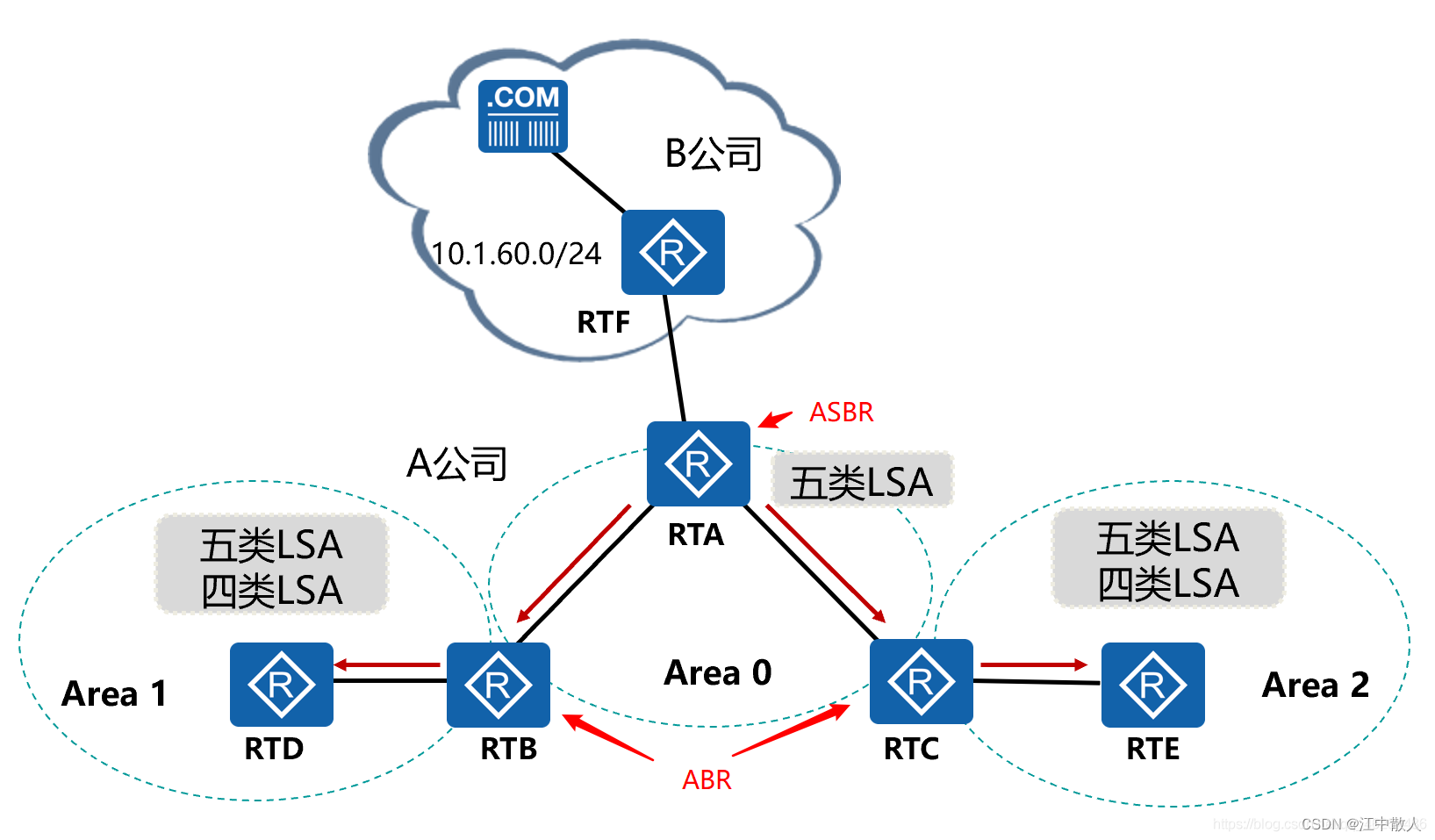 如上图,RTA产生五类LSA,并将五类LSA在整个AS(自治区域)中泛洪扩散。并在泛洪的过程中五类LSA信息不会像三类LSA一样发生变化。