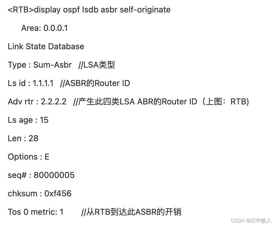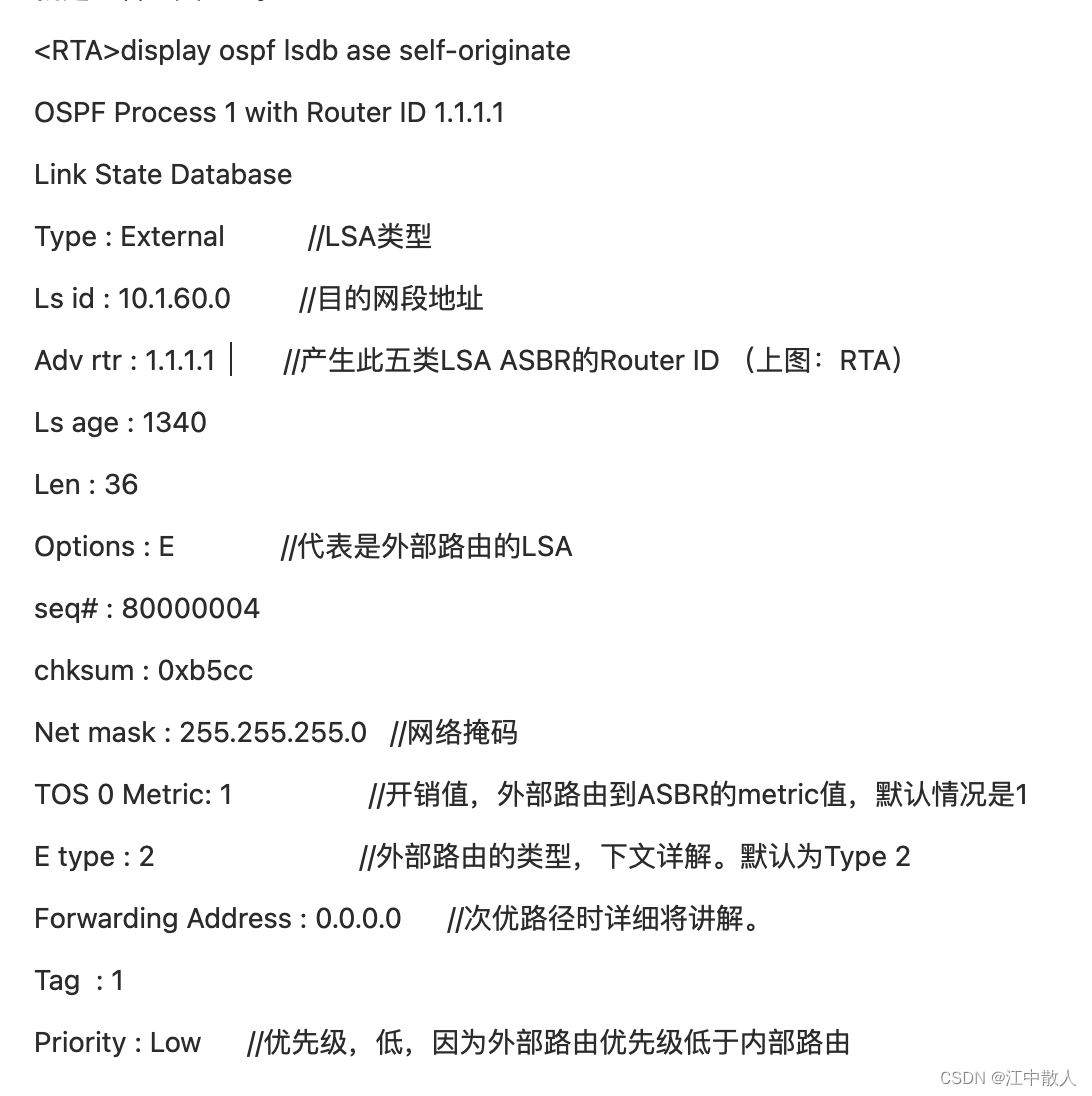 Adv rtr : 1.1.1.1 //产生此五类LSA ASBR的Router ID (上图:RTA)