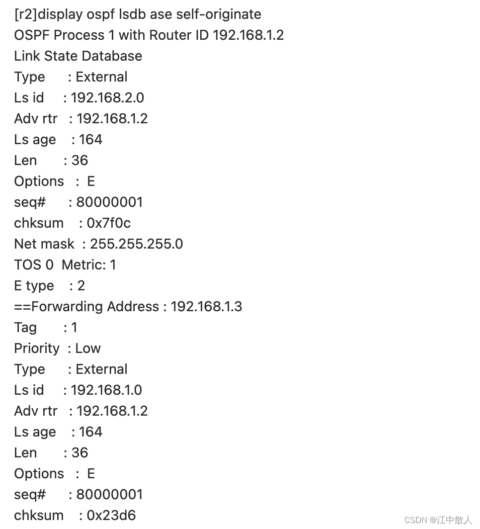 我们用display ospf lsdb ase self-originate查看LSDB中路由器自己生成的外部路由。也就是查看五类LSA。