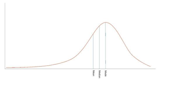 在正态分布中,平均值、中数和众数相等,但在负偏态分布中,我们将测量的中心趋势之间的一般关系表示为: