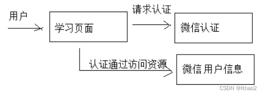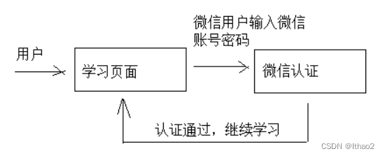 从上图可以看出,微信不属于本系统,本系统并没有存储微信用户的账号、密码等信息,本系统如果要获取该用户的基本信息则需要首先通过微信的认证系统(微信认证)进行认证,微信认证通过后本系统便可获取该微信用户的基本信息,从而在本系统将该微信用户的头像、昵称等信息显示出来,该用户便不用在本系统注册却可以直接学习。