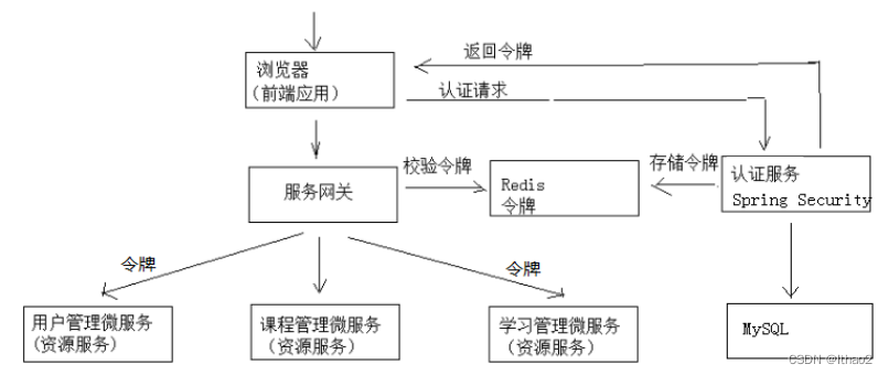 本项目采用 Spring security + Oauth2完成用户认证及用户授权,Spring security 是一个强大的和高度可定制的身份验证和访问控制框架,Spring security 框架集成了Oauth2协议,下图是项目认证架构图:
