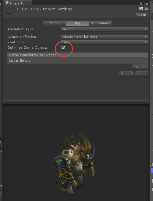 在project面板选择刚才那个模型的原始fbx文件,可以在Inspector面板看到模型导入的设置参数,在Rig里面有一个Optimize Game Objects的选项,把它勾上。