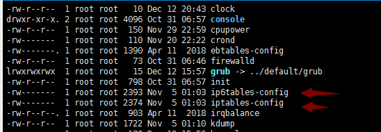 ls -l没有查看到iptables文件,但存在ip6tables-config和iptables-config,本文中的linux为CentOS 7.6 ,CentOS 7默认没有了iptables文件。