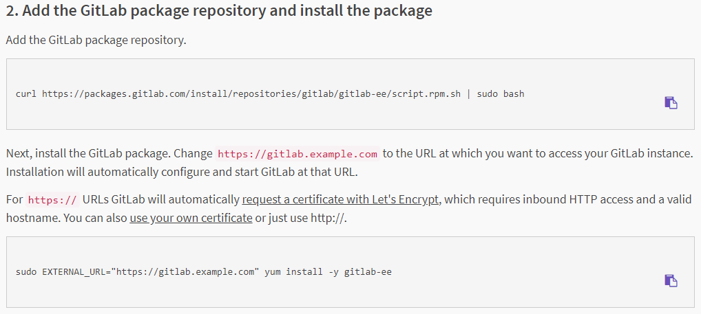 sudo EXTERNAL_URL="https://gitlab.example.com" yum install -y gitlab-ee