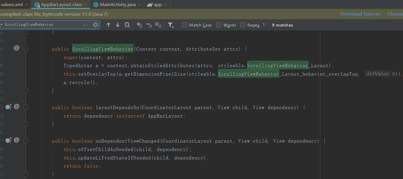 目前用的系统的这个Behavior 被依赖的是 AppBarLayout,依赖的就是我们下面的整个布局。