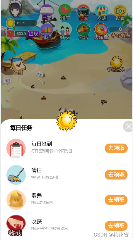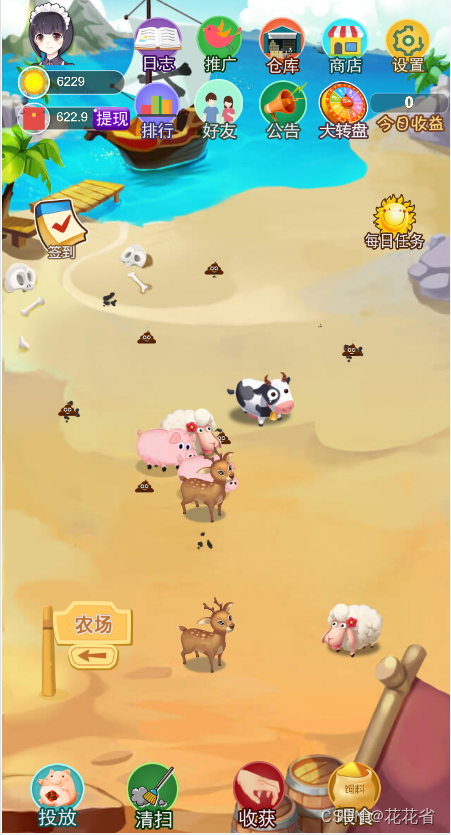 8.牧场部分:签到、投放、喂养、清扫均需要做任务才能操作,任务既是看广告模式,