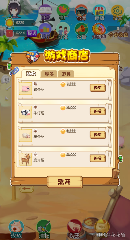 动物种类包含鸡、兔、鹅、鹿、牛、羊、猪,商店兑换得到,每日需要看广告才能有收益