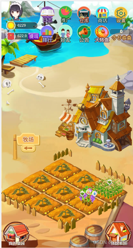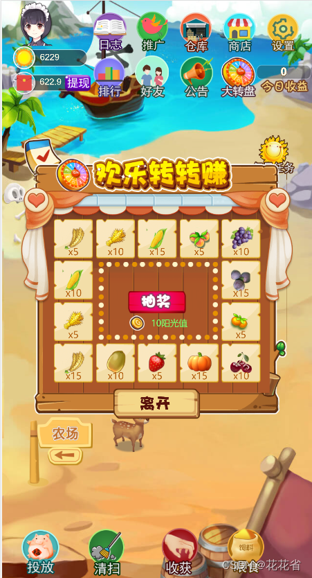 主要功能包含:种植、养殖、广告、日志、公告、排行榜、好友、商店、仓库、推广、兑换中心、装扮、大转盘、每日任务、签到等