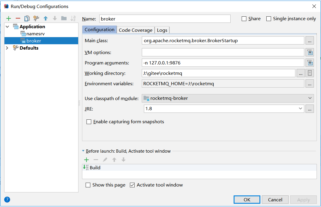 用创建NameServer启动配置的方式再创建一个,Name中输入BrokerStartup,Main class可以选择broker模块下的BrokerStartup类,Use classpath of module中可以选择broker这个module,具体的配置如下图所示: