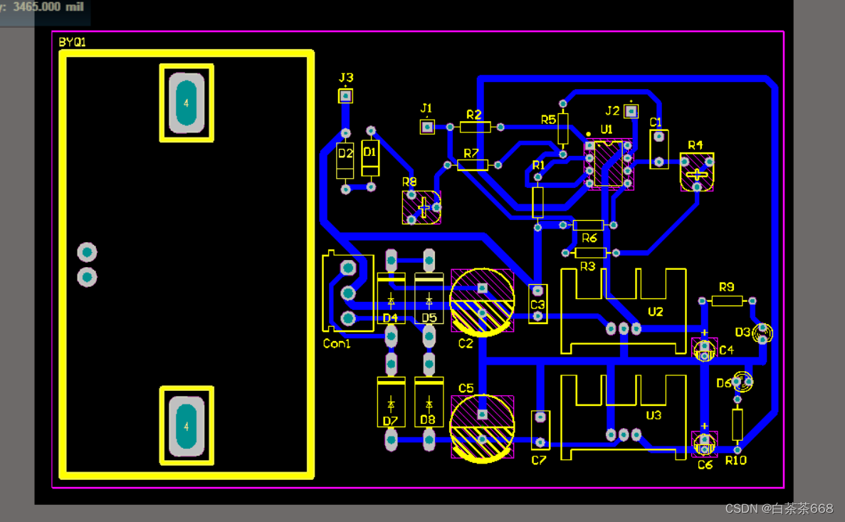我们根据要求画出实验电路的原理图,有些元器件的封装需要自己画,例如:7812与7912、NE5532芯片、电位器等。根据测量元器件来确定孔径的大小,元器件管脚间的距离以及元器件的大小。还有的就是在画原理图是导线的该有连接点处时要注意检查。导入PCB后改好规则,地线1.5mm、电源线1.2mm、其他1mm、安全距离10mil、去掉Top layer。布好局后连线,布局时要留出一定位置来放变压器,放置姓名学号(需镜像)。选择keep-out layer 绘制边框大小需要控制在10*15mm内,再选择Bottom layer 把安全距离改为1mm,覆铜后再改回10mil。这样制版的第一步就做好了。