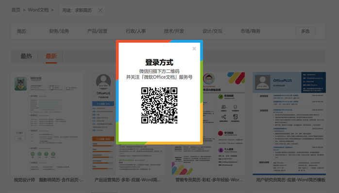 接着想到了officeplus,熟悉的界面,熟悉的下载按钮。点击一下,就能直接下载到高质量的文档……等等,怎么没有加入下载队列,反而弹出来了一个二维码?定睛一看,微信扫描下方二维码,并关注「微软Office文档」服务号。