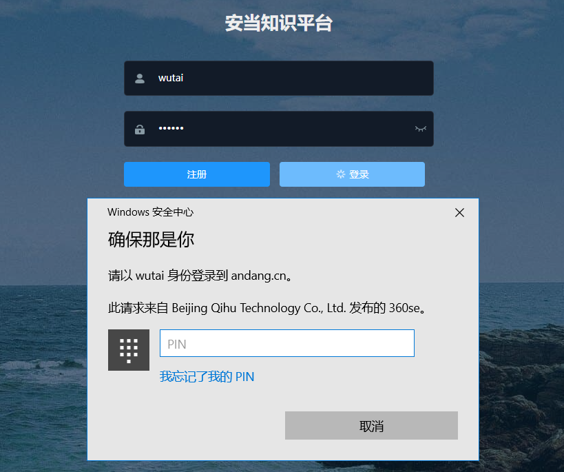 3、用户输入用户名和密码(也可以仅使用FIDO作为登录,双因素认证需要开启密码),点击登录即可拉起FIDO登录,图中示例为hello pin注册的,如果是人脸,指纹,或者FIDO key则会拉起相应的验证器。登录完成!