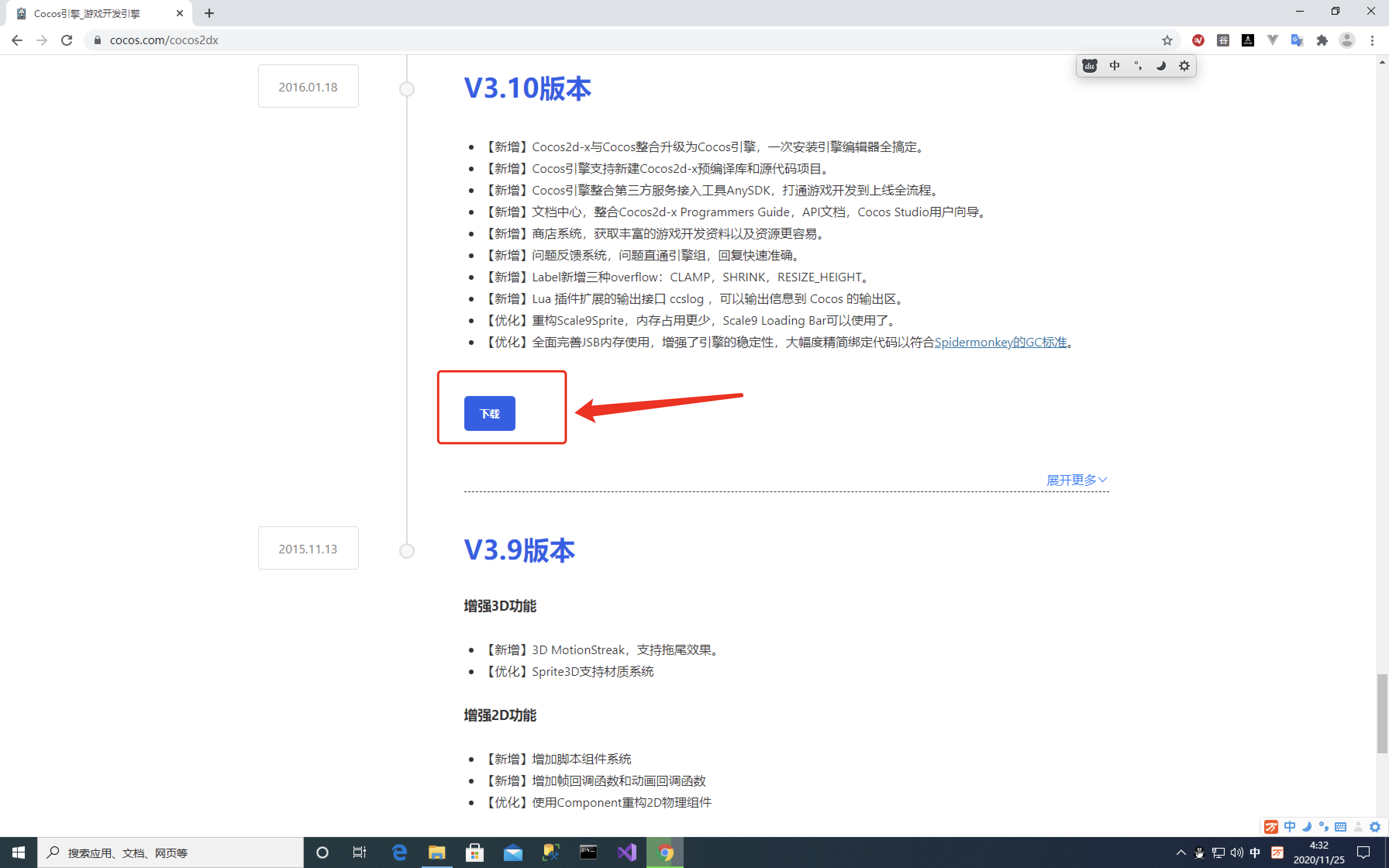 进入cocos2d-x下载页面,默认是V4.0向下拉,找到3.10版本并下载