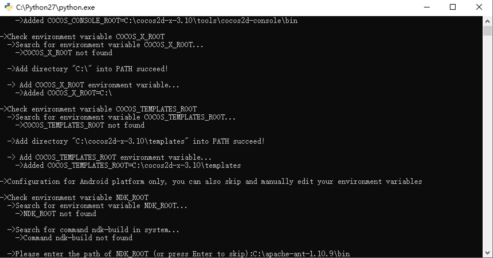 ant,ndk,cocos3.10都下载并解压后,移动到C:盘,然后运行C:/cocos2d-x-3.10目录下的setup.py(在运行前先安装Python 2.7)