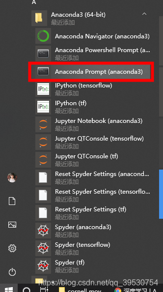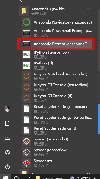 因为Anaconda环境主要用 conda 命令,所以在 Windows 和 Linux 系统下操作基本一样,在 Windows 下打开 Anaconda Prompt,在 Linux 下打开 终端,然后就可以用命令行来执行安装 Tensorflow