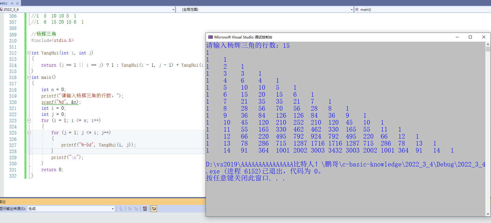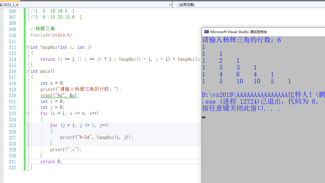 return (j == 1 || i == j) ? 1 : YangHui(i - 1, j - 1) + YangHui(i - 1, j);