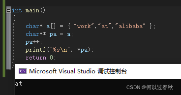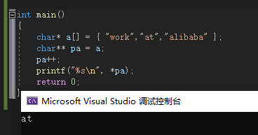 这个题也比较简单,首先 char*a[]是一个内含char*类型地址的指针数组,在初始化时初始化了3个字符串,但这个指针数组内存放的就是三个字符串的地址,再用二级指针**pa指向了指针数组a,pa++就指向了at的地址,打印%s就会打印地址指向的内容,如果是%p,那么就是at的地址。